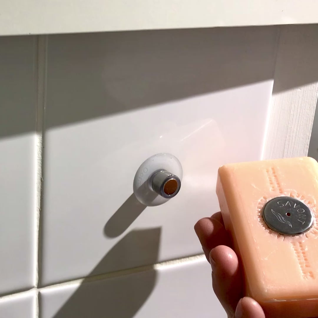If you don't have a ledge near your bath, sink or shower, these are for you. Ingenius little things: magnetic soap holders. They are a two part gizmo - one half is a sucker with a magnet which sticks to the shiny wall or tile, the other part is a metal 'crown' shape that you embed in your soap and then it sticks to the magnet on the wall! So clever. I've made you a little video to demonstrate.
