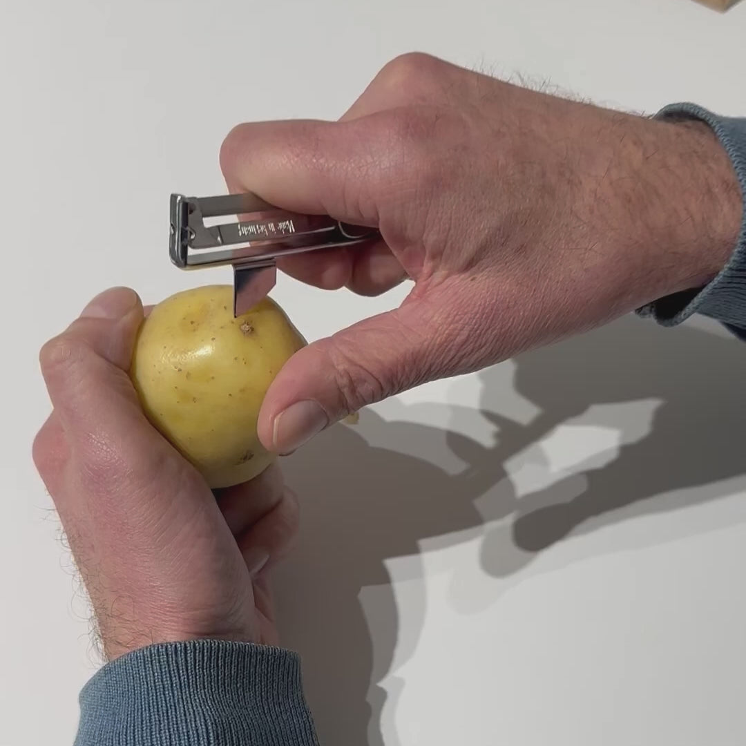 What a beautiful thing this stainless steel swivel peeler is. German made by Westmark. What they don't know about 'peeling, cutting and dividing' isn't worth knowing. A great all round peeler, but particularly recommended for longer fruit and veg (cucumbers if you prefer those peeled, for example). It has a very good pokey bit for potato 'eyes'.